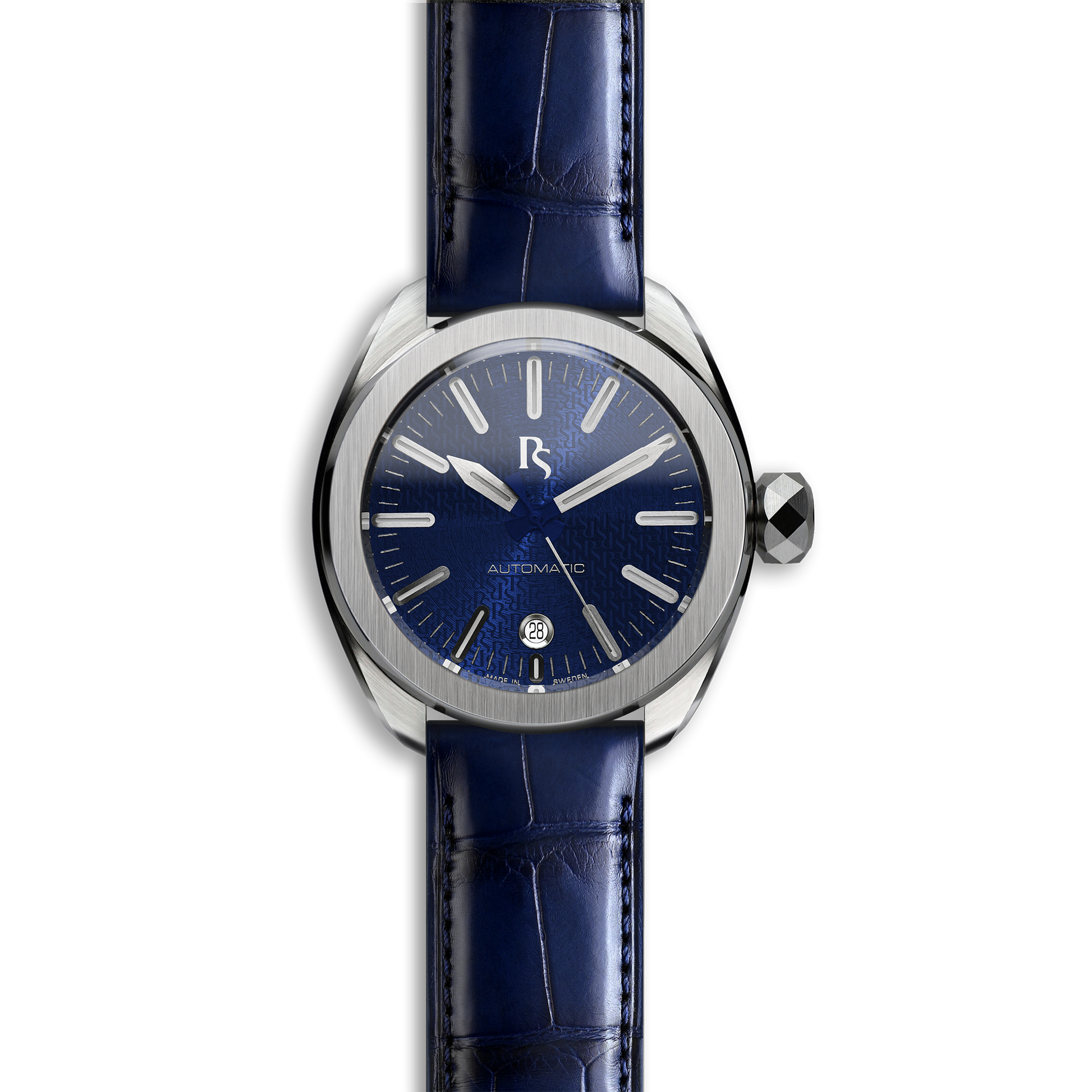 Manufactured and assembled in our own in-house workshop in Sweden. Using only the finest Swedish materials. A meticulously crafted case from certified high-grade 904L stainless steel with a beautiful open case-back display. Non-distortion, anti-reflective coated double domed sapphire crystal enhances clarity of the exclusive & beautifully decorated Swiss automatic movement. Certified by our own artisan watchmakers with a 56-hour power reserve. The Royal Blue sun-ray brushed multi-layered sandwich dial with applied indexes and Swiss C-1 Superluminova™ and PS pattern create an unique play of light. Our leather straps are timeless and elegant a perfect complement.